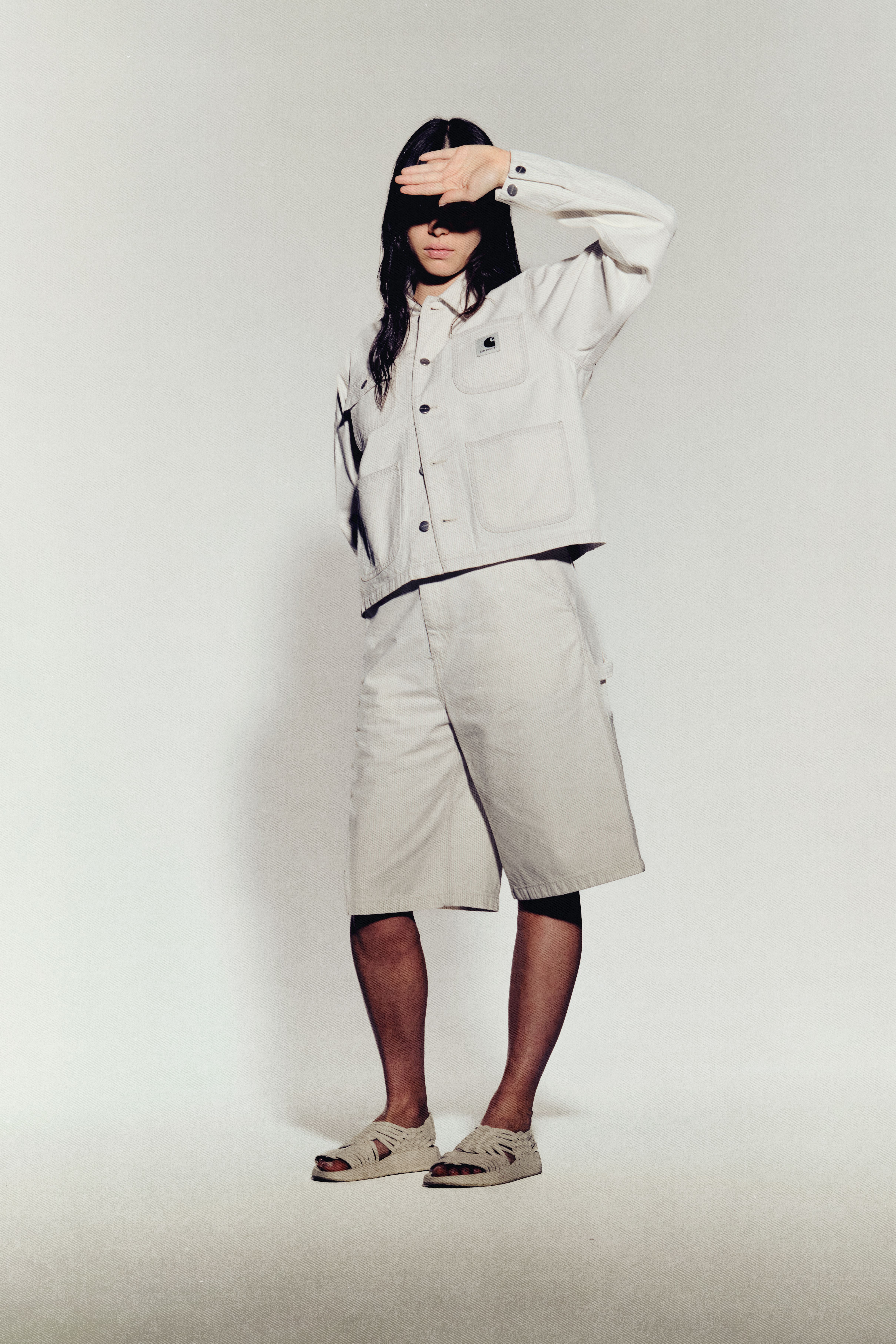 The season launches with our canvas icons, where overalls, work pants, and jackets are executed in a misty palette of dusty Hamilton Brown, light blue and taupe, alongside earthy browns and pops of red. Meanwhile, chalk washes and saturated finishes appear on colored denim, as well as on Nelson jersey sweats and a bleached hickory striped fabric. These are offset by a new ‘camo snake’ print, which features on trucker-style jackets, oversized cinch-back shorts, and short-sleeve shirts.